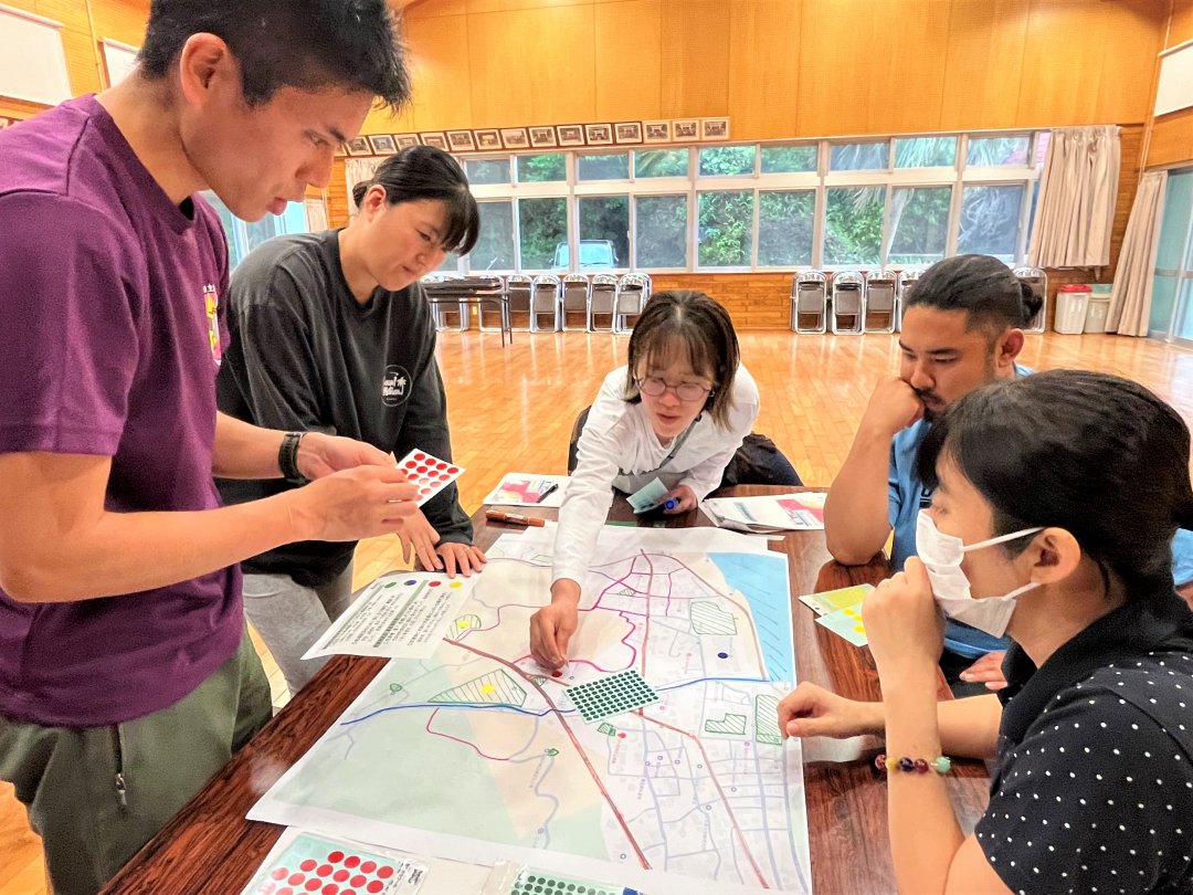 辺士名区公民館で実施された当セミナーでは、大人向けに『災害図上訓練ゲーム』を実施し、地域の地図を用いて、災害が発生した時に生じる被害や課題を検討しました。また、子ども向けには『防災教室』を実施し、災害についての基本的な情報や防災に関する標識、避難する時に何を持って逃げるかなどについて、ゲームなどを取り入れて楽しく学びました。