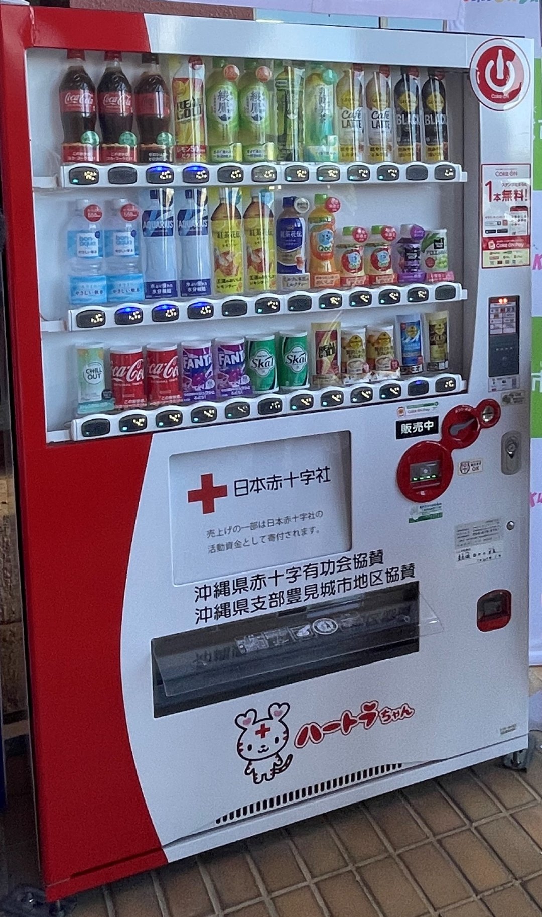 この寄付金付自動販売機には、赤十字のキャラクター「ハートラちゃん」のデザインがラッピングされており、購入された飲料代の一部が赤十字活動への寄付となる仕組みです。