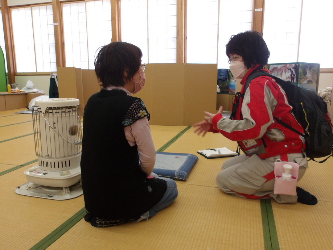 現地では保健師から依頼を受け、主に避難所にいる要観察者の方について、精神科医療の要否等のアセスメントを行い継続支援につなげる活動を取組んでいます。