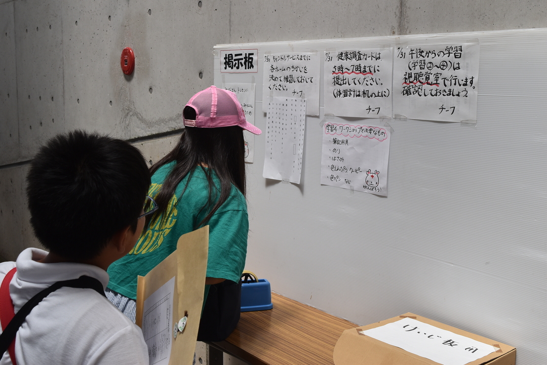 掲示板で先生たちからの連絡を確認(小学校の部)