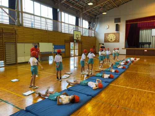 マットを水に見立て「浮いて待つ」姿勢をとること。水に落ちてしまった友達にペットボトルを投げ、声がけして救急隊の到着を待つことなどをシミュレーションしました。