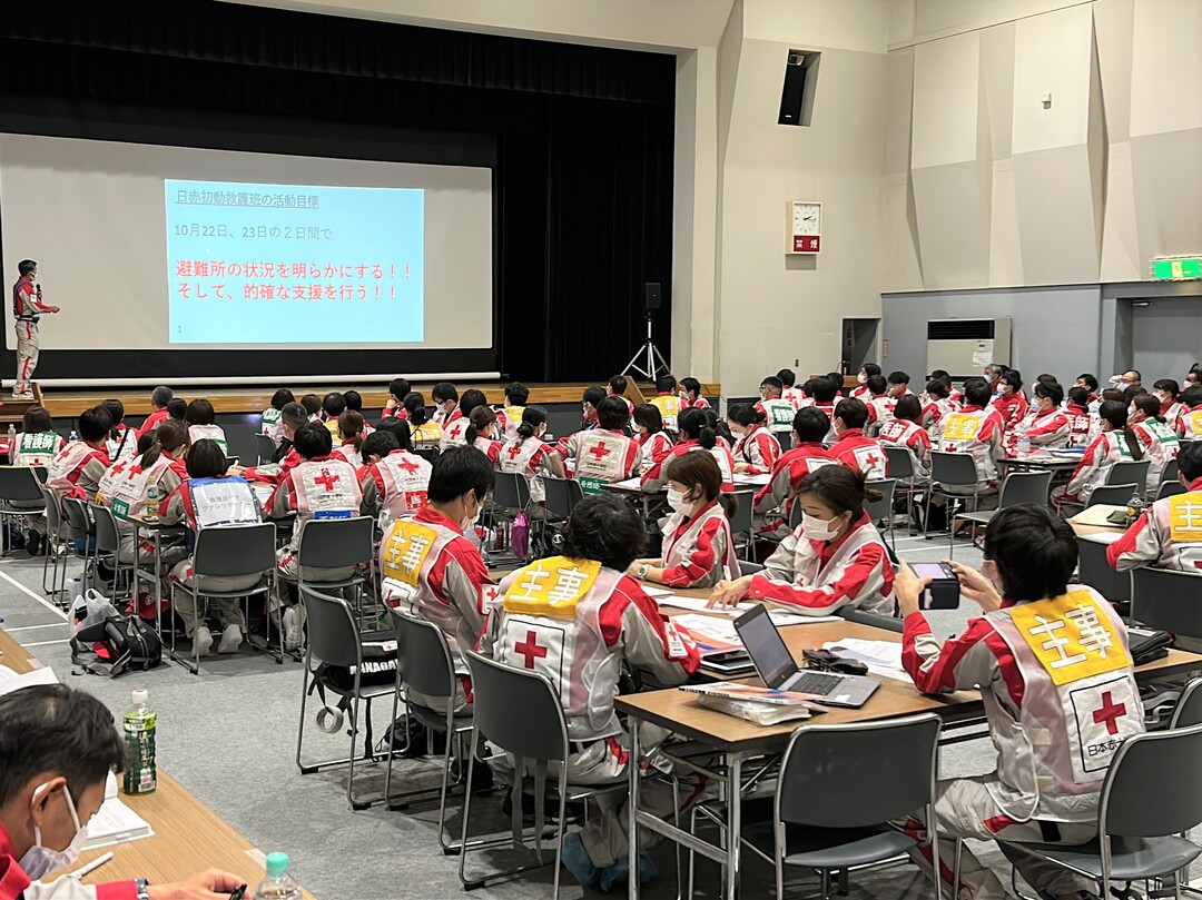 土砂崩れが発生、道路の寸断やライフラインへの影響が残る発災3日目の想定で行い、県内外から駆け付けた日赤救護班が12カ所に設定した避難所を巡回して被災者に寄り添った救護活動を行いました。
