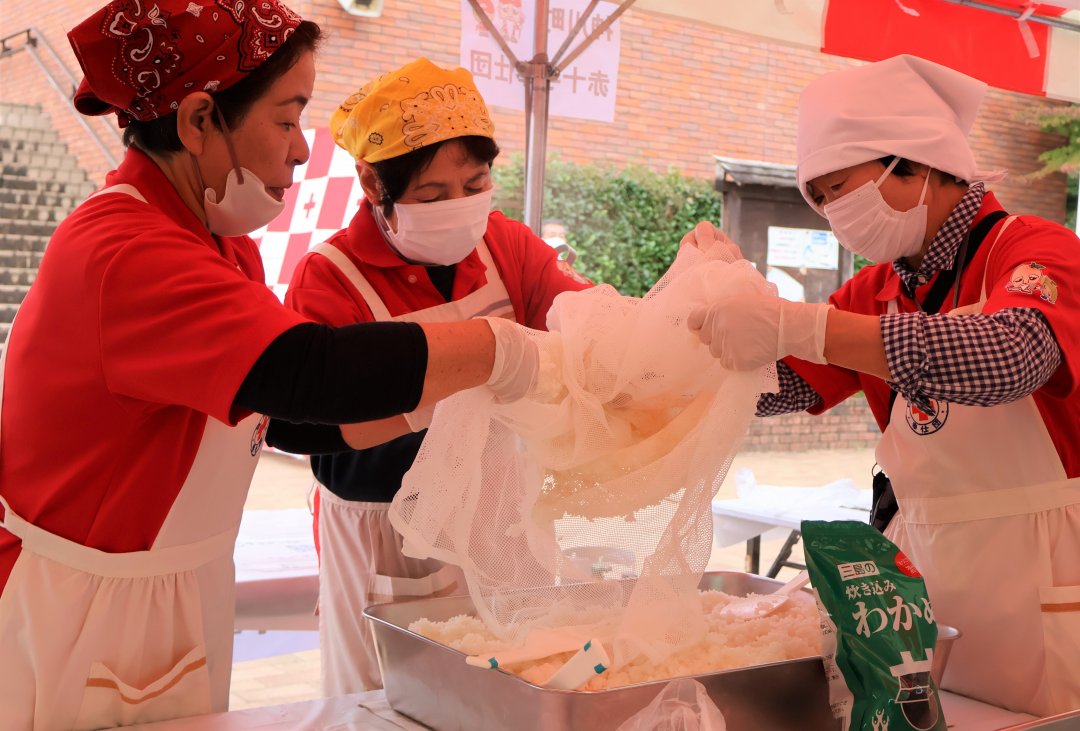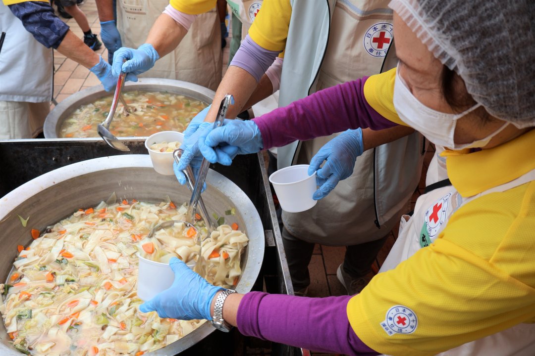 地域赤十字奉仕団(各地域に組織されるボランティア団体)は、災害時に行政などと連携して、炊き出しなどで被災者を支援します。