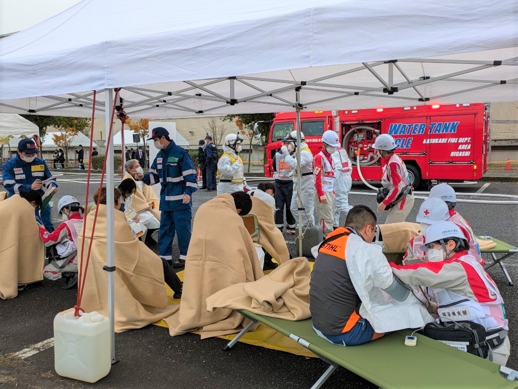 訓練は、イベント開催中、30年前に大阪で実際に使用された猛毒の化学剤「VX」が散布され、多数傷病者が発したという想定で行われました。