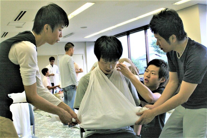 日常生活における事故防止や手当ての基本、胸骨圧迫や人工呼吸の方法、AED(自動体外式除細動器)を用いた除細動、止血の仕方、包帯の使い方、骨折などの場合の固定、搬送、災害時の心得などについての知識と技術が習得できます。