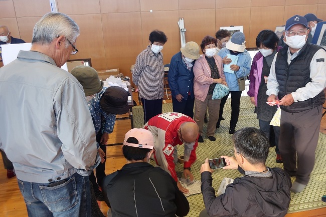 避難所想定の体育館に日本赤十字社島根県支部コーナーを開設し、避難所で役立つグッズの作成や応急手当として三角巾を使用した捻挫、脱臼、骨折の固定、大出血時の止血法等を行い、多くの市民の方で賑わいました。