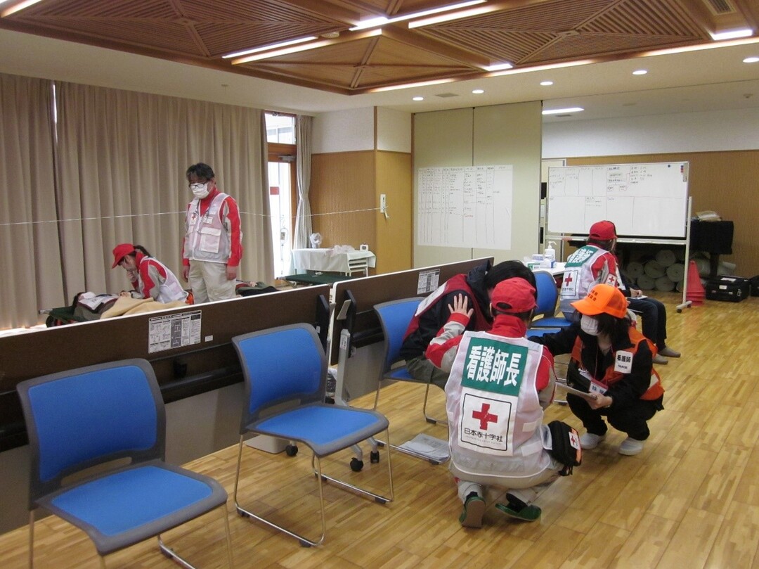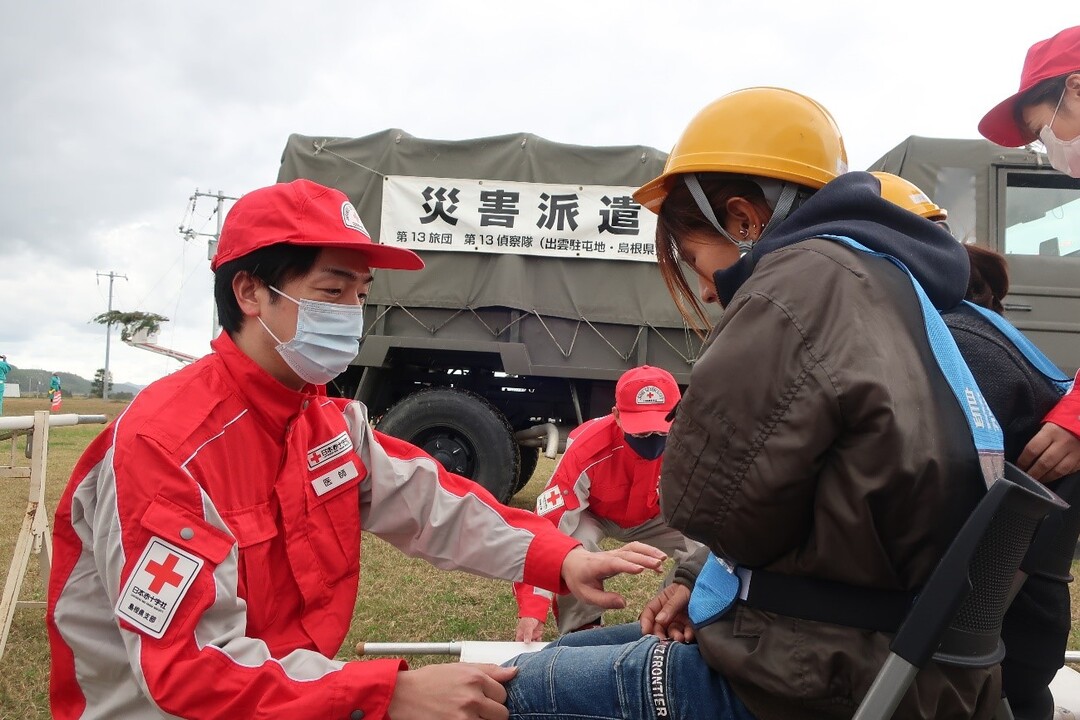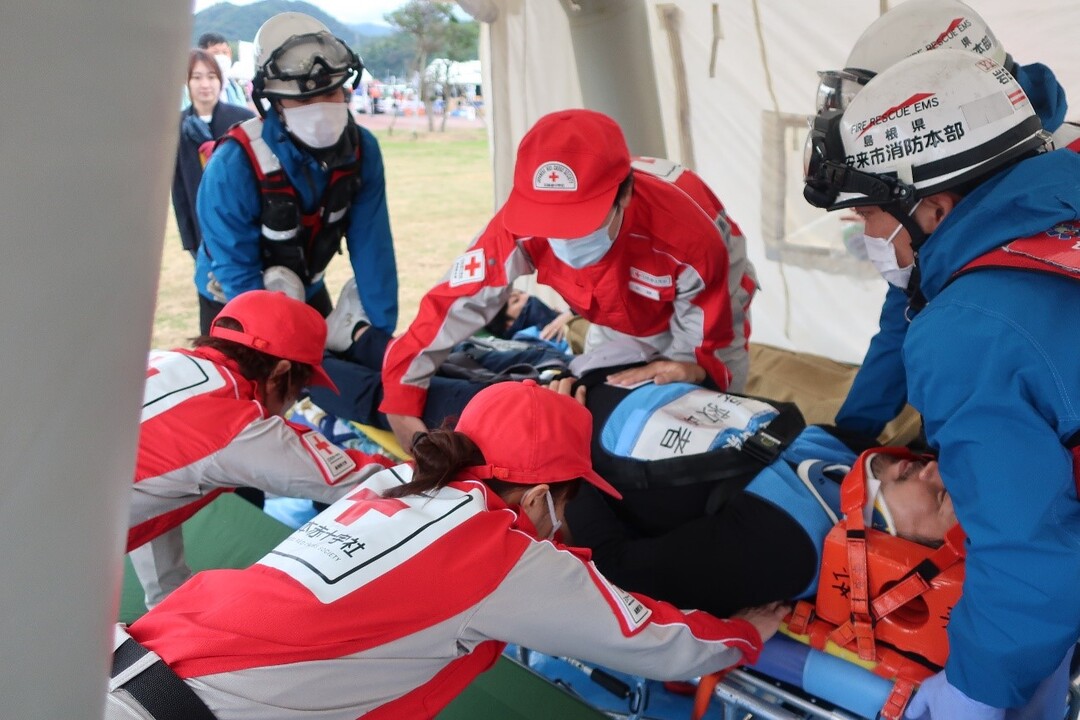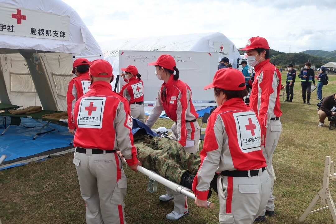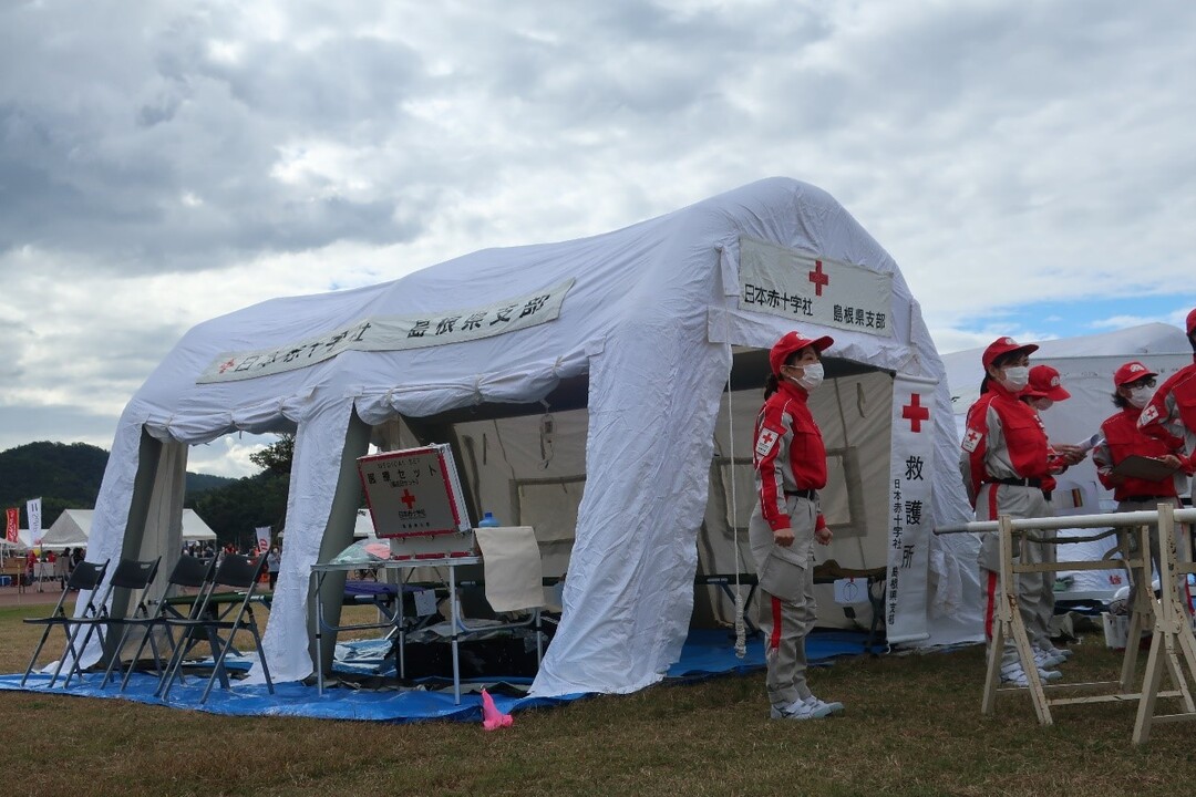 日本赤十字社島根県支部、松江赤十字病院救護班、そして隣県からの災害救護支援として鳥取県支部、鳥取赤十字病院救護班が参加しました。