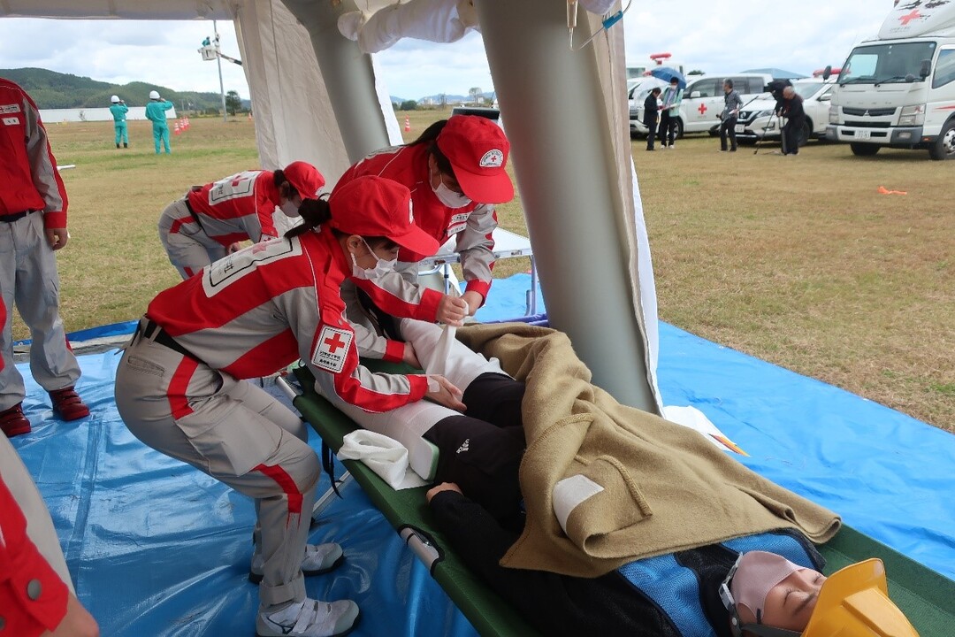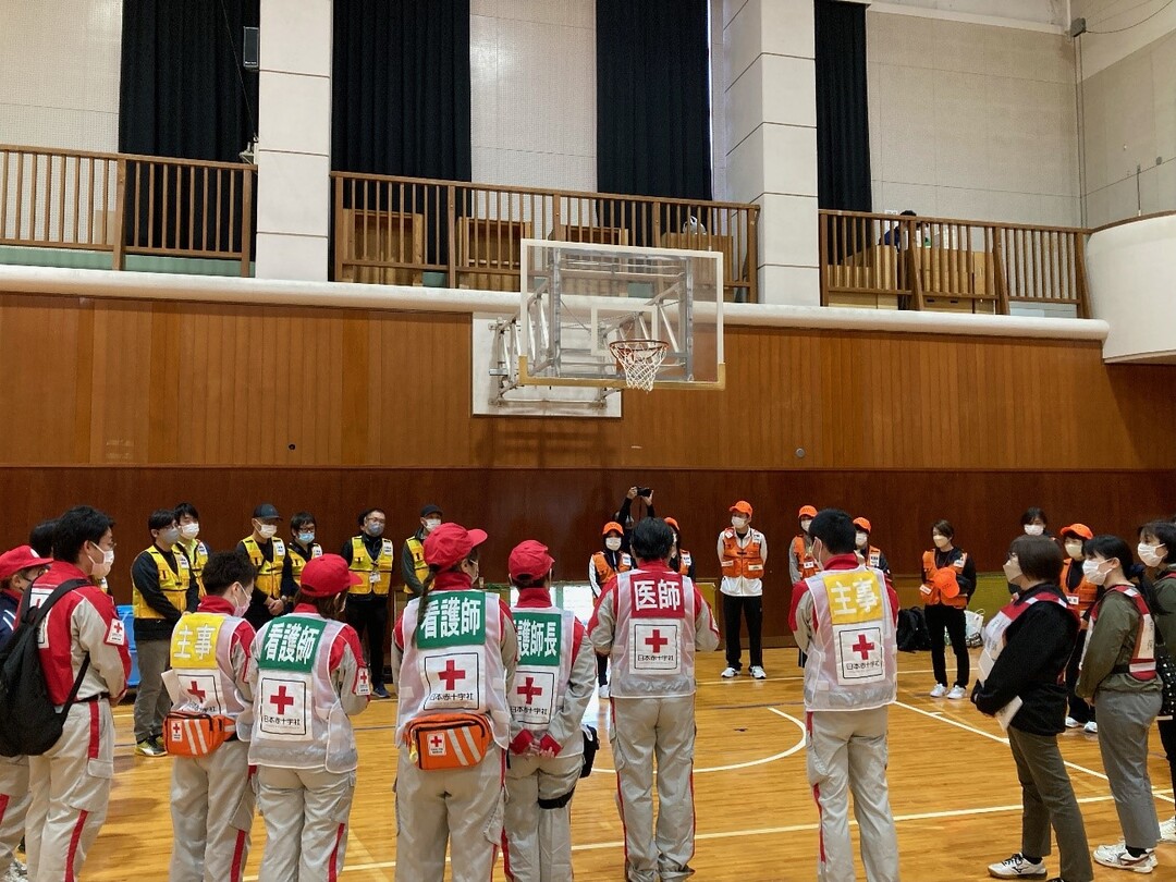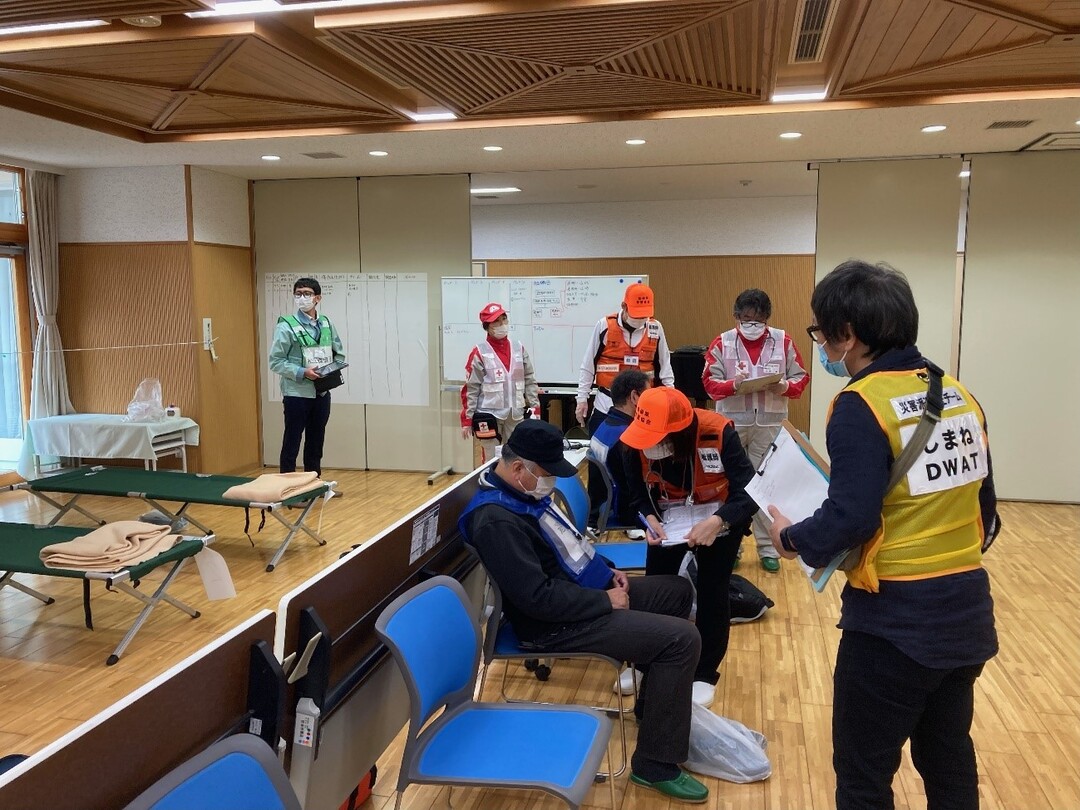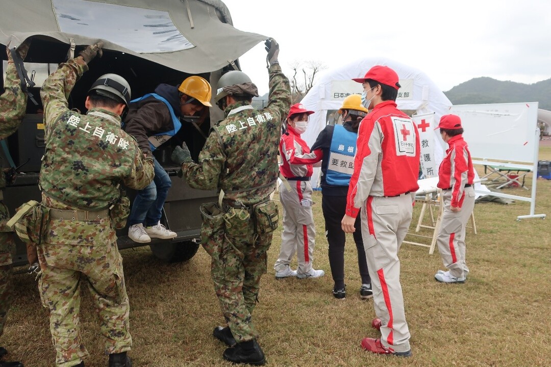 日本赤十字社島根県支部、松江赤十字病院救護班、そして隣県からの災害救護支援として鳥取県支部、鳥取赤十字病院救護班が参加しました。