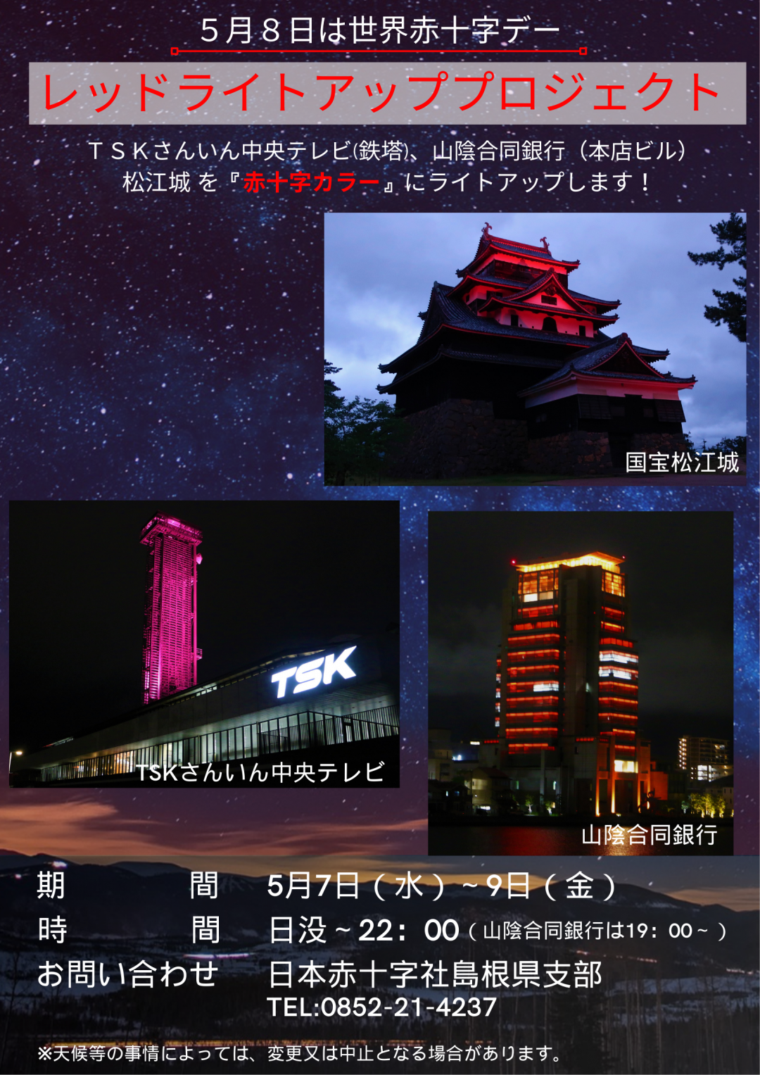松江城、TSKさんいん中央テレビ(鉄塔)、山陰合同銀行(本店ビル)を 『赤十字カラー』にライトアップします!