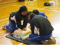 2時間の講習でしたが参加した生徒さんたちは、救急車が到着するまでの間、救命手当を迅速に行うことが重要だということを学び、心肺蘇生とAEDを用いた電気ショックの方法を繰り返し練習しました。