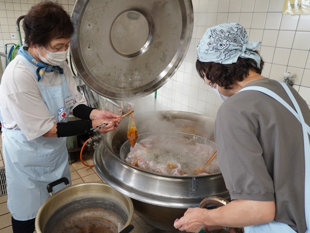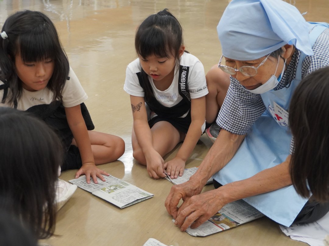 はじめに、赤十字奉仕団と防災ボランティアの活動を伝えその後、奉仕団が炊き出しや新聞紙で作るスリッパ体験を行いました。青少年赤十字(JRC)の態度目標である「気づき・考え・実行する」をテーマにした話し合いも行い、子どもたちの意見を大切にしました。