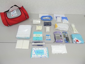 携帯ラジオ、懐中電灯、風呂敷、ブックレット(災害時に気をつけたい症状)などがセットになった災害救援品