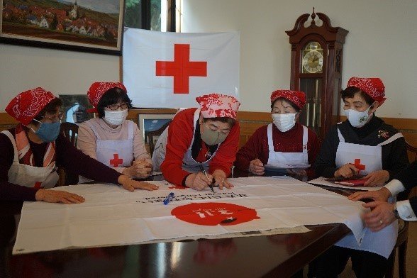 応援フラッグに寄せ書きを行う本県地域赤十字奉仕団の藤田育美委員長
