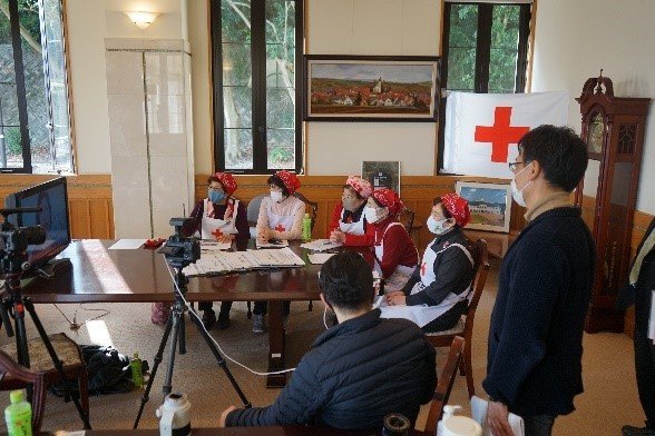12月10日に行われた取材には、炊き出し支援活動に参加した本県の地域赤十字奉仕団員5名が参加。宮城県で4回実施した炊き出し支援の概要や炊き出しメニュー、被災者との交流を目的とした阿波踊りなどについて、当時の写真や映像を交えながら、熱心に説明する奉仕団員の姿が見られました。