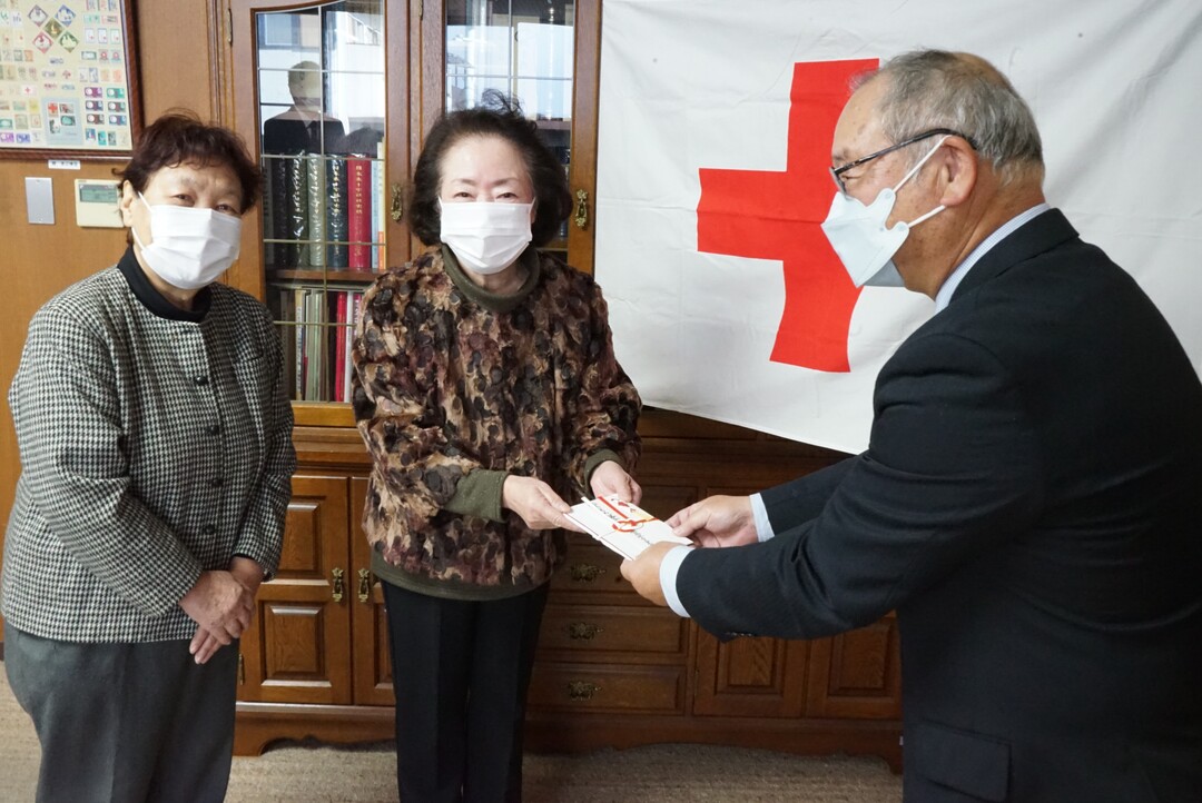 12月22日に行われた贈呈式では、同協会の代表者2名から当支部の新居事務局長に寄付金を手渡しました。代表者は「微力ではあるが、災害や紛争、病気などで苦しんでいる世界の人々を救う赤十字の国際活動などに役立てて欲しい」と思いを述べられました。