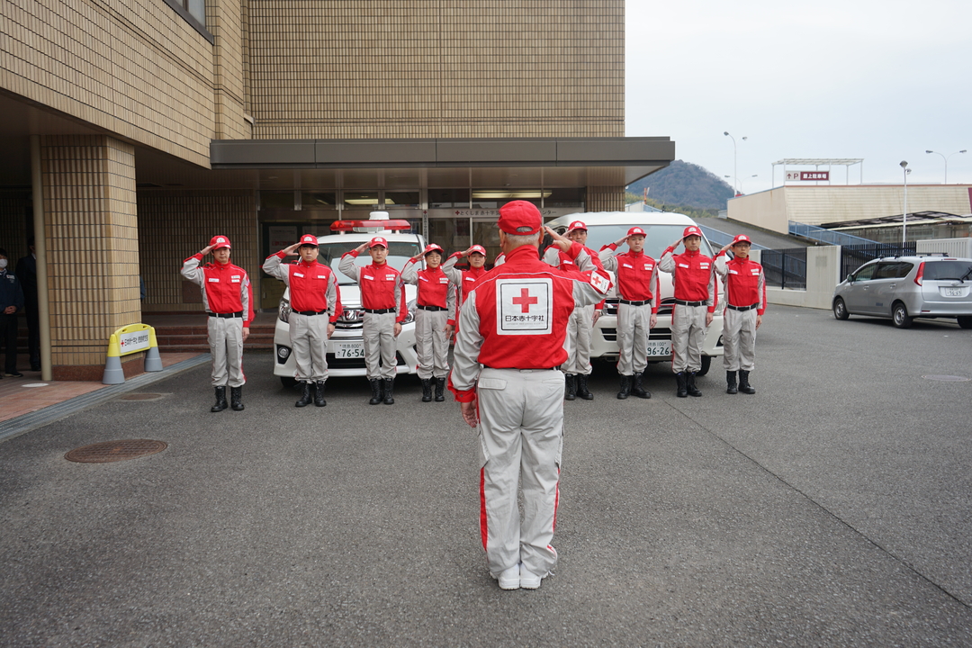 31日の出発式では、新居事務局長から「今もなお、断水が続いており、衛生環境も不安な状況ではあるが、いのちを守るという赤十字の使命に基づいて活動に取り組んでほしい。」と激励を受け、徳島赤十字病院の手島医師が「被災者の方に寄り添い、全力で救護活動に取り組みます。」と決意を表明しました。