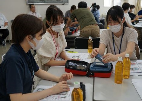 参加者はAEDの必要性やAEDにより救命された事例などを学んだ後、AEDが正常であることを示すランプの目視確認や傷病者の胸に貼る電極パッド、バッテリーの交換方法などを確認。その後、蘇生人形を使って、胸骨圧迫やAEDの使用方法の実技訓練に挑みました。