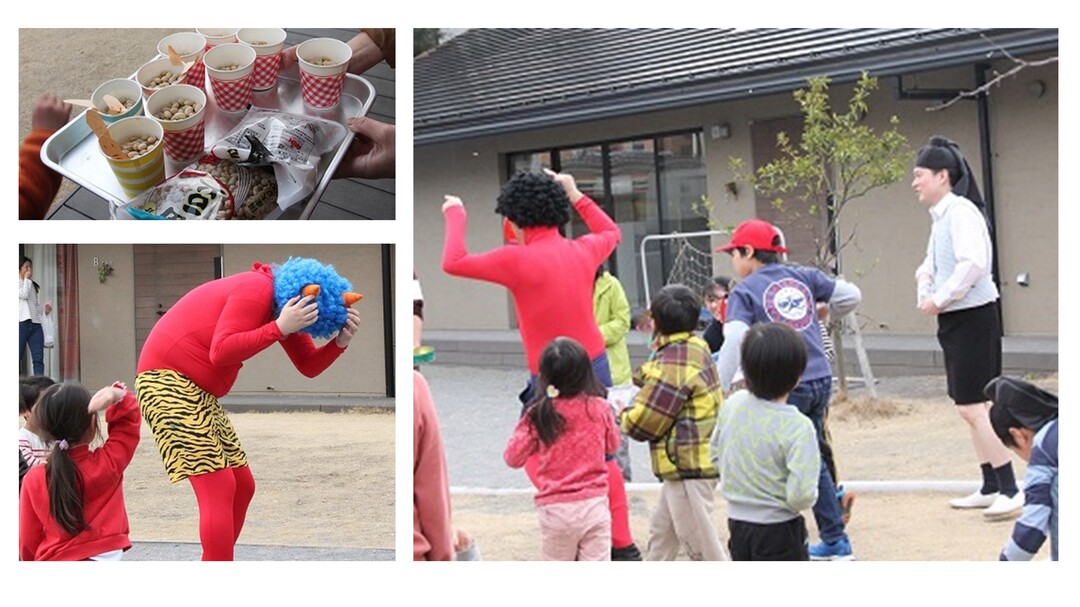 2月3日の節分の日、武蔵野市にある児童養護施設「赤十字子供の家」には大きな歓声と笑い声が響き渡りました。この日、タイタン所属タレントの皆さん(脳みそ夫さん、シティホテル3号室の川合さん、押田さん、XXCLUBの大谷さんの計4名)が子供たちを楽しませるために来てくれました。前半は、体操や持ちネタの披露など、笑いに包まれたお楽しみ会が大盛り上がり。子供たちはもちろん、職員も大いに楽しみ、日頃の疲れを忘れる時間となりました。後半は園庭に出て、気持ちよく空気の澄んだ快晴の空の下で豪快に豆まきを楽しみました。タレントの皆さんが鬼となり、子供たちが投げる豆を文字通り全身で受けとめていただきました。イベントが終わっても興奮冷めやらない子供たちの様子から、特別な思い出がひとつ増えたことを確信した一日でした。