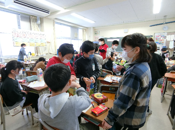炊き出し体験をしてもらいたい気持ちは抑え、今年度行ったのは≪牛乳パックを使った一人用非常食セット作り≫。「重いものは下だよ」「この賞味期限はいつ?」「これじゃパックの口が閉じないよー」と、おうちから持参したレトルト食品や缶詰、お菓子を入れたり出したり。みんな目を輝かせながら、楽しんで体験をしていました。