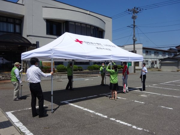 交付式に参加いただいた地域赤十字奉仕団委員長や地区分区職員の方々にワンタッチテントの操作についての説明を行いました。