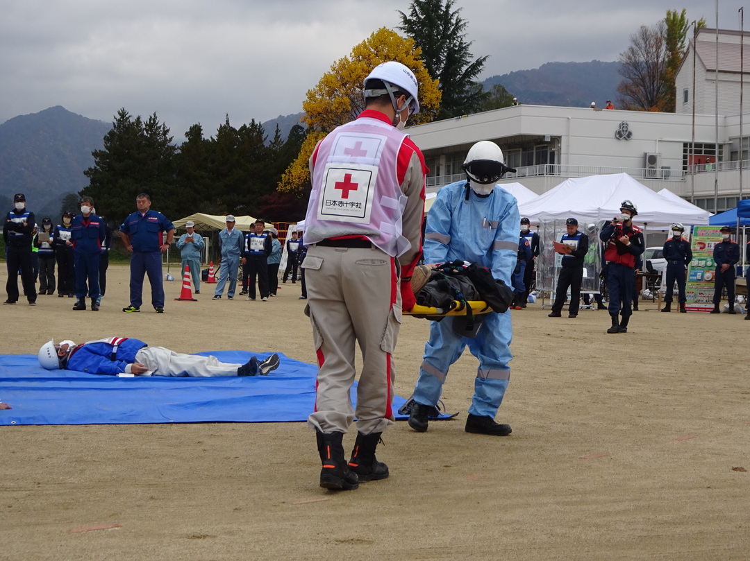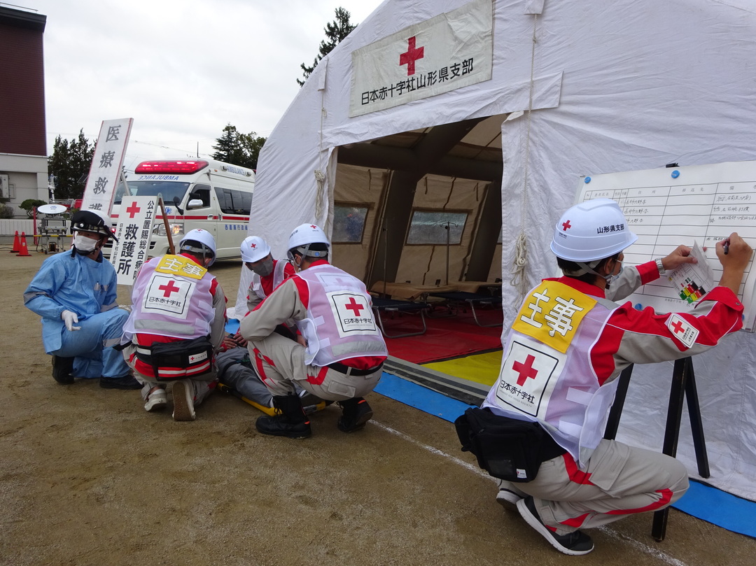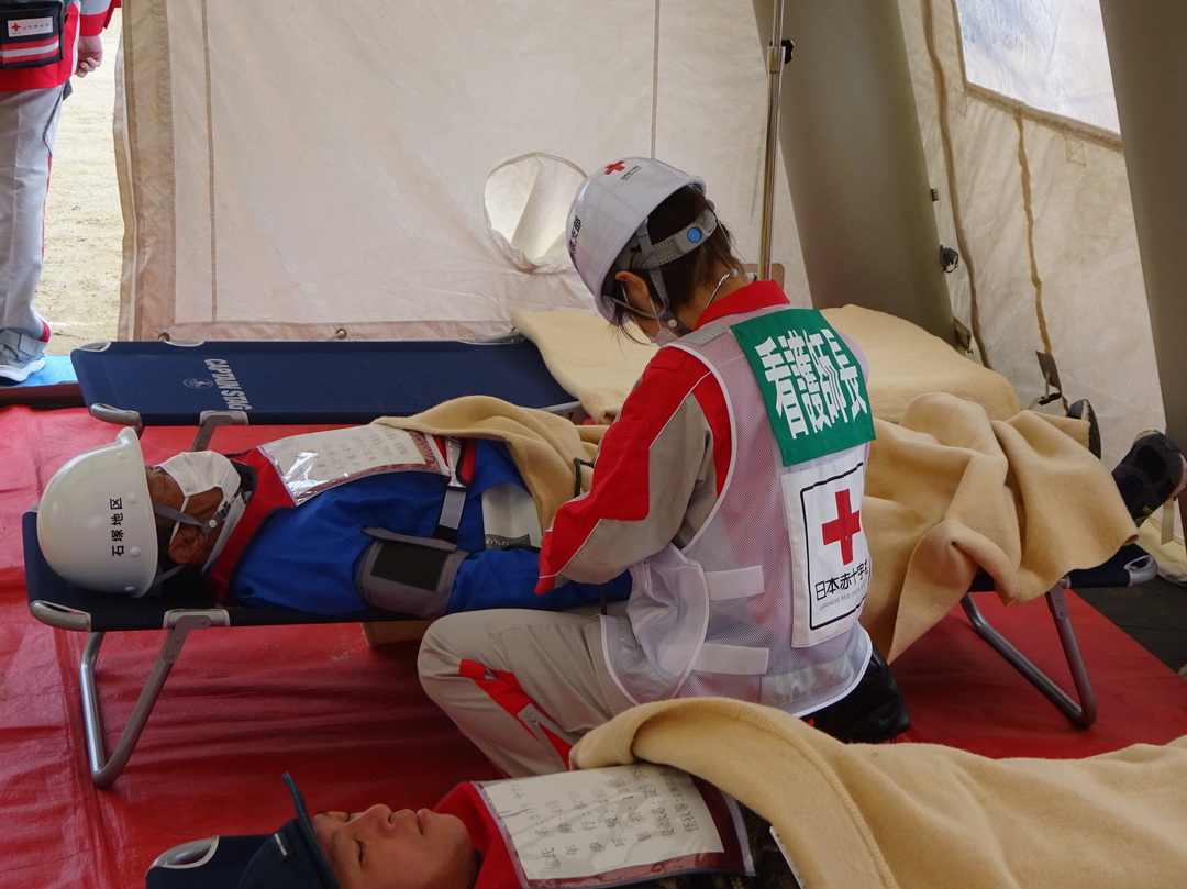 赤十字救護班は現地に医療救護所を設置し、救出救助訓練の現場から消防と日赤職員が搬送してきた傷病者に対し、トリアージと医療処置を施す医療救護訓練を行いました。