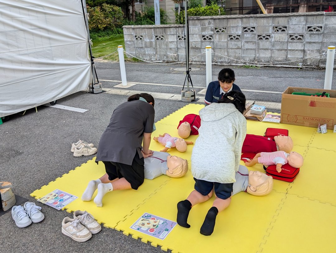 また、展示・体験コーナーには救急法指導員1名、支部職員1名が参加し、一次救命処置や身近なものを利用した応用担架などを紹介する赤十字救急法体験ブースを設置し、市民の方々にご紹介しました。