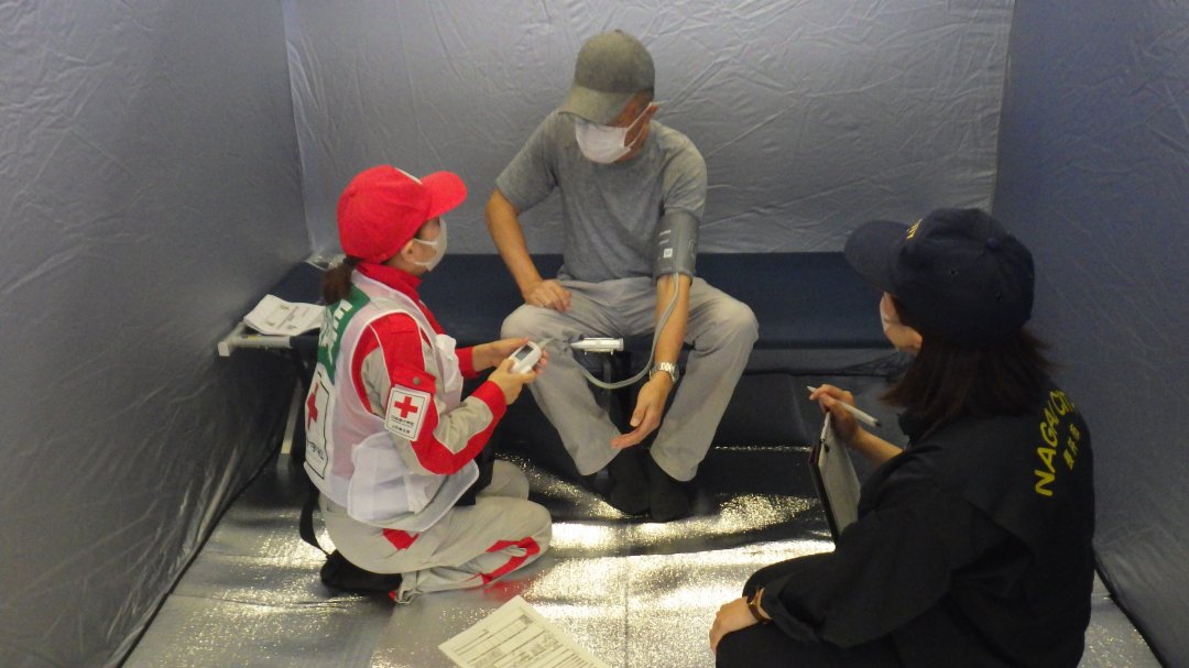体育館の中に仮想避難所を設置し行われた避難者支援訓練には日赤米沢市立病院救護班3名、支部職員1名が参加し、発災から5日経過した想定の避難所の健康相談等を長井市保健師と協力して行いました。