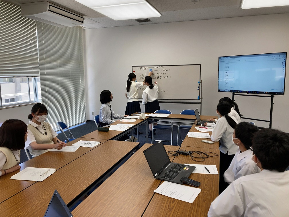 会ではまず、第一回役員会以降に実施した、各校のJRC活動や地区の活動について発表し、意見交換を行い、続いて、夏に開催予定となっている学習交流会のテーマについて協議しました。障がい者スポーツや、手話、防災など様々な案が出ましたが、最終的には、「コロナ禍で高校生になって、国際交流が全くできていない」という発言をきっかけに、「外国の文化を学びたい」という意見が多くあがったことから、テーマは『国際理解・親善』に決まりました。