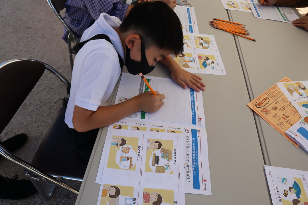 当支部と血液センターは、『おうちのキケン』のワークショップをおこないました。このワークショップでは、自宅の平面図を描きながら、地震で起こる被害や家具の安全対策の必要性について考えることができます。参加者は自宅のキケンな箇所に×をつけながら、家に帰ってから家族と安全対策について話をすることなどを宣言されていました。