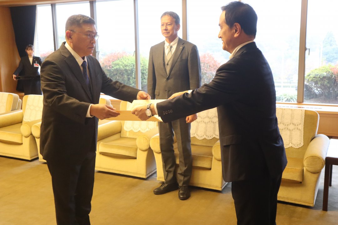 令和6年11月27日(水)、山口県庁知事応接室において支部長である村岡知事から、岩国市の有限会社善本工業様に紺綬褒章が伝達されました。