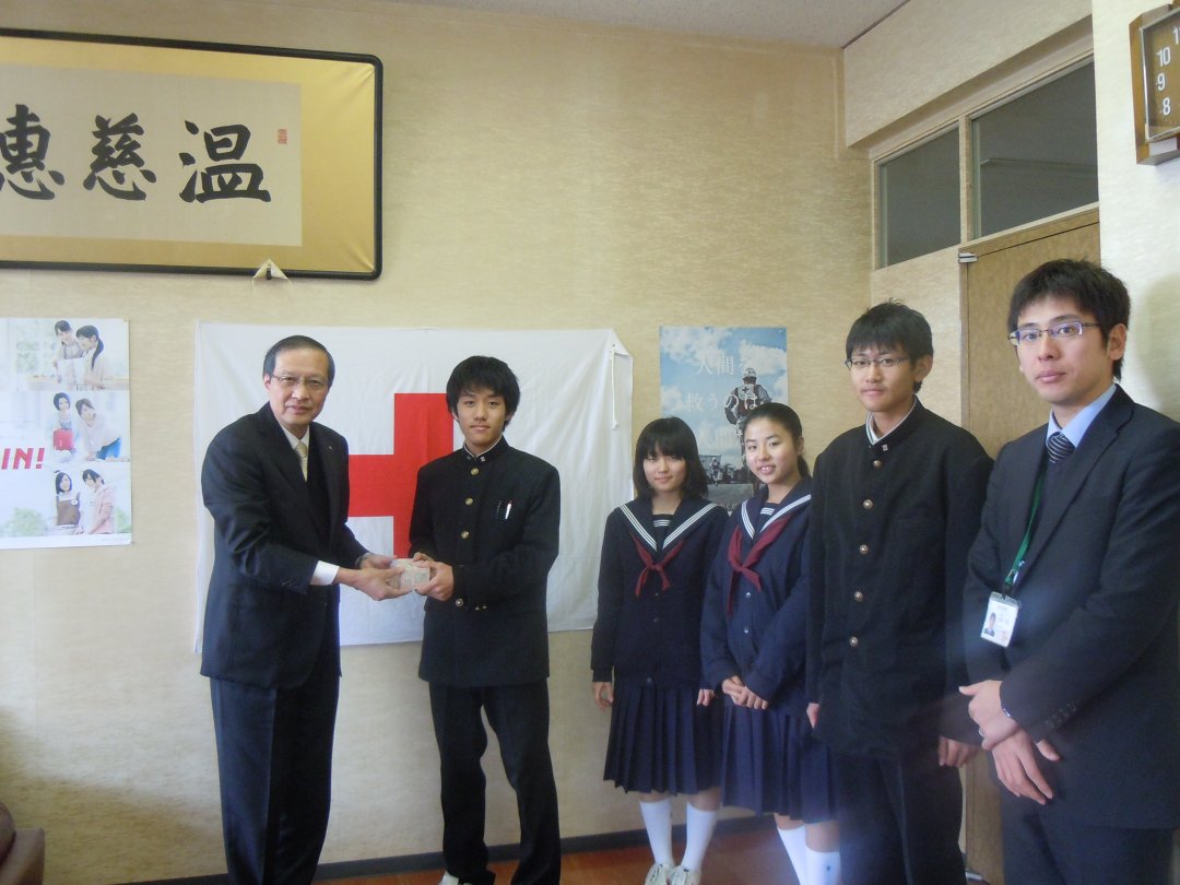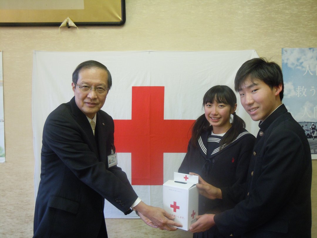 平成25年12月24日(火)、青少年赤十字(JRC)加盟校である山口市立白石中学校、山口市立大殿中学校、山口市立平川中学校の生徒会メンバーやJRC委員メンバーが、学校で集めた「海外たすけあい」募金を持ってきてくれました。