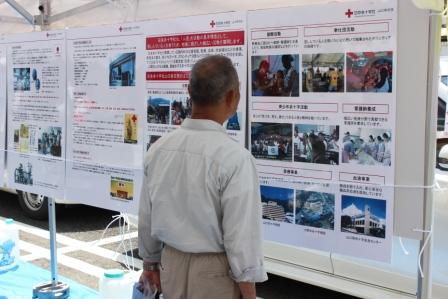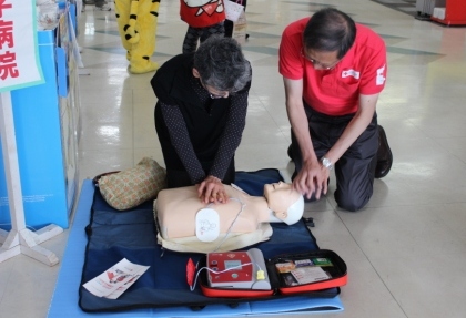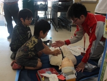 日赤山口県支部では、胸骨圧迫の方法やAED(自動体外式除細動器)の使い方を練習していただいたり、赤十字についてのパネル展示、災害救援物資の展示等を行いました。
