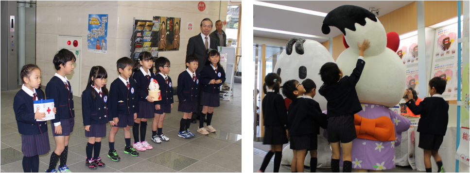 藤村学園旭幼稚園の園児さん8名が早速、園で集めた募金を届けにきていただきました。