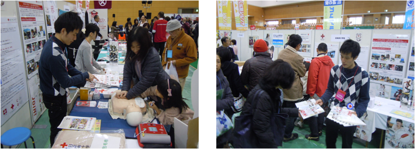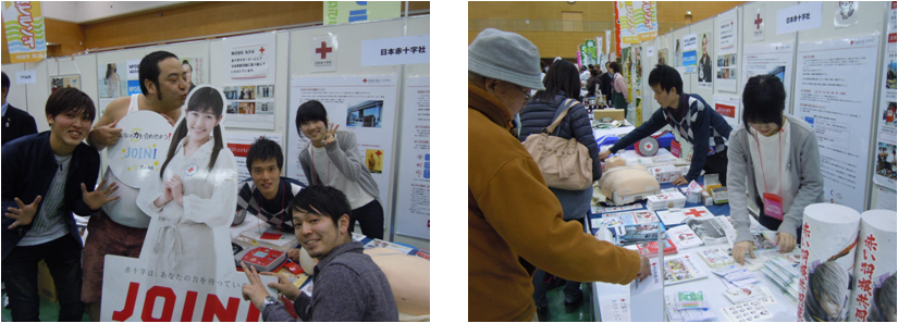 ブースでは赤十字紹介パネルの展示やAED体験コーナー、