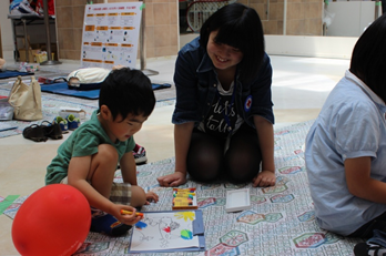 この日、山口県青年(学生)赤十字奉仕団は独自のブースとして子どもたちへ絵本の読み聞かせやぬり絵コーナーを運営しました。