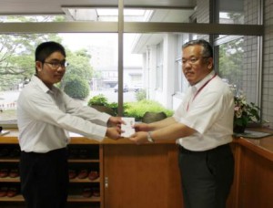 JRC部の福田大伽(たいが)部長(2年生)から救援金を受け取りました。