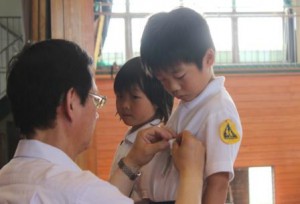 牟礼南小学校でも、山本校長先生から、新入生代表の2名の児童にバッチの贈呈があり、児童全員が大きな声で「ちかい」を唱和し、青少年赤十字の一員としての自覚をあらたにしました。