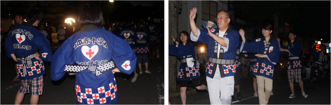 日本赤十字社山口県支部は紺色のはっぴに赤十字が浮かびます。
