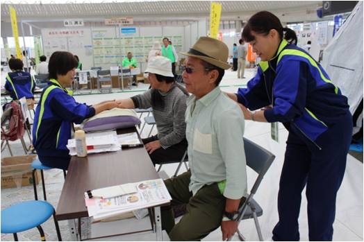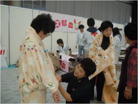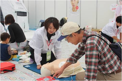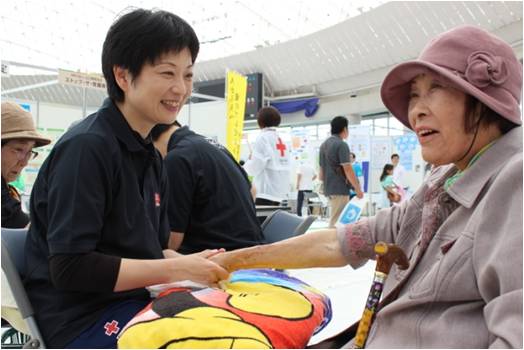 心肺蘇生やAEDの使い方を学ぶ救急法講習、毛布を使ったガウンの作り方など避難所で高齢者の方に対してできる支援を身に付ける「災害時高齢者支援講習」講習、山口赤十字病院、小野田赤十字病院の看護師によるハンドマッサージやリラクゼーションを来場者の方に体験していただきました。