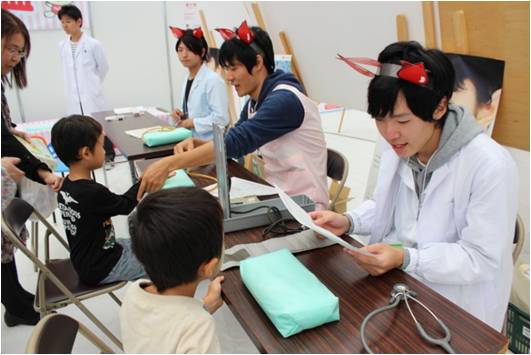また、17日午後と18日は、まだ献血をすることができない子どもたちを対象にした献血の擬似体験「キッズ献血」を行いました。山口県学生献血推進協議会の学生ボランティアらが看護師、医者の役に扮し、子ども達に楽しく献血を体験してもらいました!