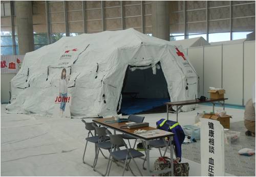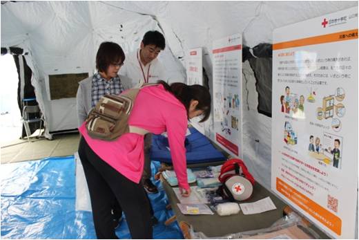 赤十字の活動紹介パネルや、災害時に被災された方へお渡しする救援物資、仮設診療所として使用するフレーム一体型大型テントを展示しました。