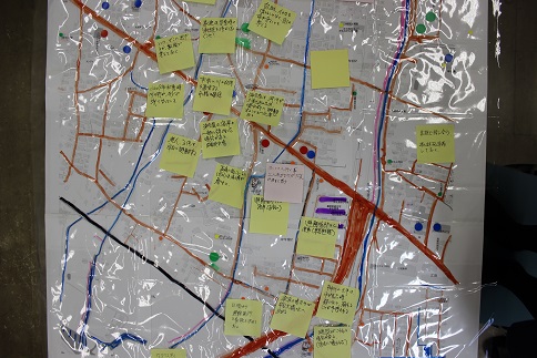 学習会のまとめとして、参加者の居住地の地図に、主要道路、防災・減災に必要な施設、
