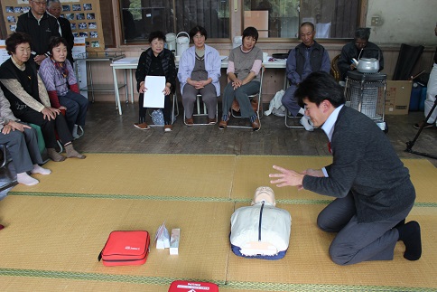 また、AEDを使った心肺蘇生法、三角巾、カーディガン・スーパーの買い物袋等