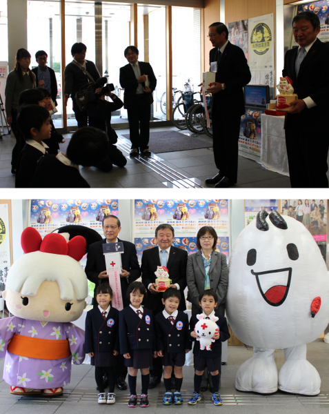 セレモニーでは、青少年赤十字加盟園の山口市藤村学園旭幼稚園の園児さん4名が、声をそろえて「世界の困っている人たちや社会の福祉に役立ててください。」とメッセージを伝え、園で集めた募金を届けてくださいました。
