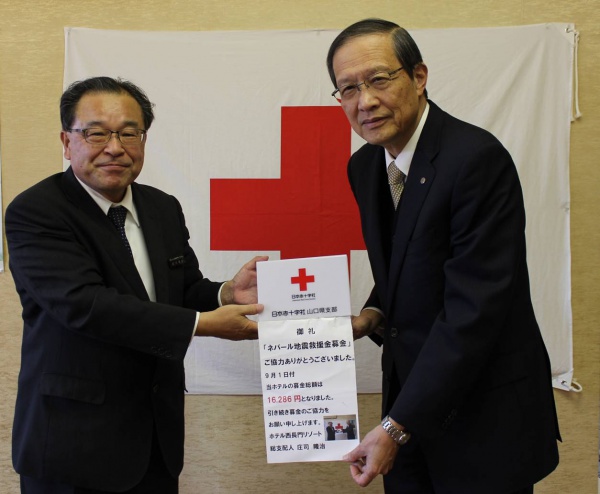 平成27年12月16日、株式会社鴨川グランドホテル ホテル西長門リゾート様から「日赤活動資金」を届けていただきました。