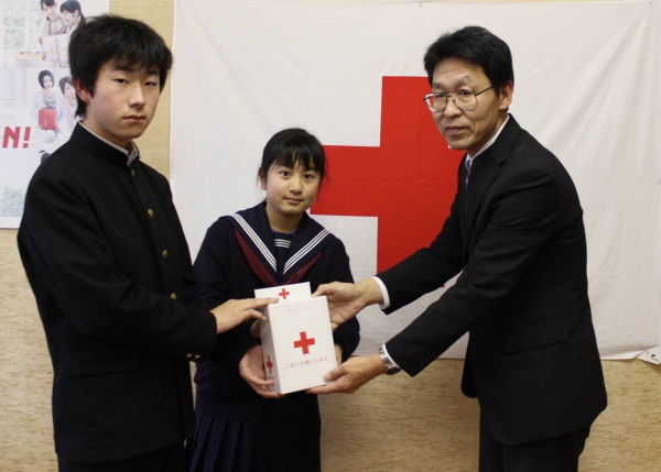 12月21日、山口市立白石中学校が全校生徒で取り組まれた海外たすけあい募金を届けていただきました。