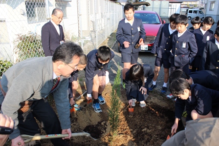 この日は、朝の校内放送で、宇田川校長先生とイトスギの苗木の育成を行っている山口県青少年赤十字賛助奉仕団の室委員長からシンボルツリーの由来や植樹の経緯などの説明の後、校舎内の花壇にJRC委員会と緑化委員会の児童30名が高さ約1メートルの苗木を植えました。