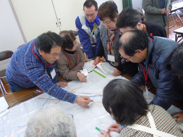 まず、自治会単位の6グループで、ディグ(災害想像ゲーム)という手法を使った災害図上訓練を行いました。参加者はテーブルに広げた居住区の地図を囲み、河川や道路、狭い路地など地域の構造や自然条件について色を塗ったり、自分の家や危険箇所、防災施設などにマークをしたりして、防災に必要な情報を「見える化」しました。