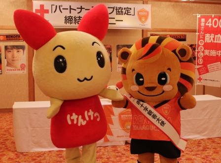 マスコットキャラクターのレノ丸くん、献血推進キャラクターのけんけつちゃんが締結式に出席。