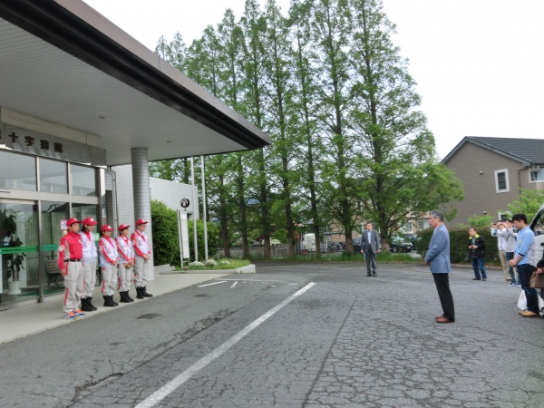 第3班については、小野田赤十字病院の職員を主体に編成(小野田赤十字病院佐藤智充副院長以下、看護師長1名、看護師2名(内、こころのケア指導者1名)、主事2名、山口県支部連絡調整員1名、計7名)され、24日7時00分、 水田英司院長の激励を受け熊本に向け出発しました。